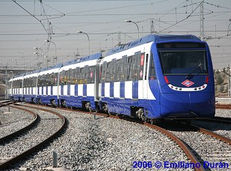 The 88 cars of class 6000 were acquired from CAF for Line 9 and its suburban stretch to Arganda del Rey. It was the first type of train in Madrid with two adjacent cars (36 m) being permanently linked via a gangway.