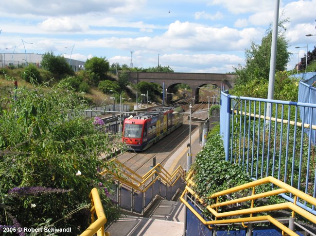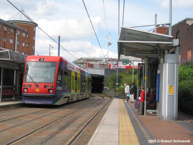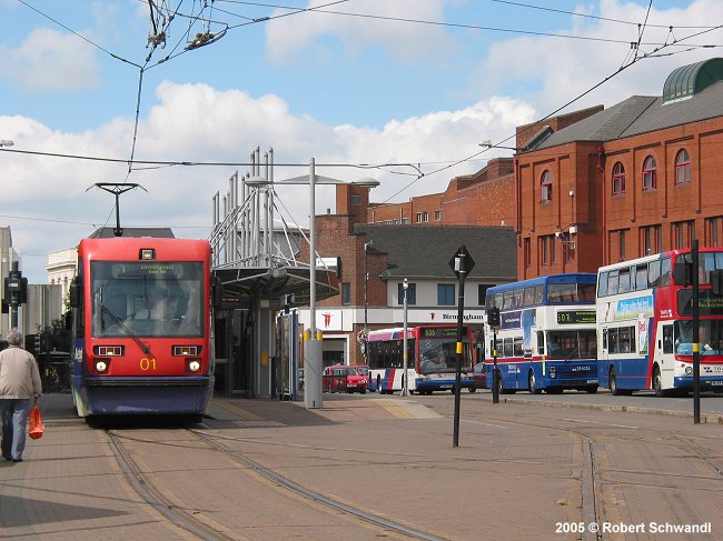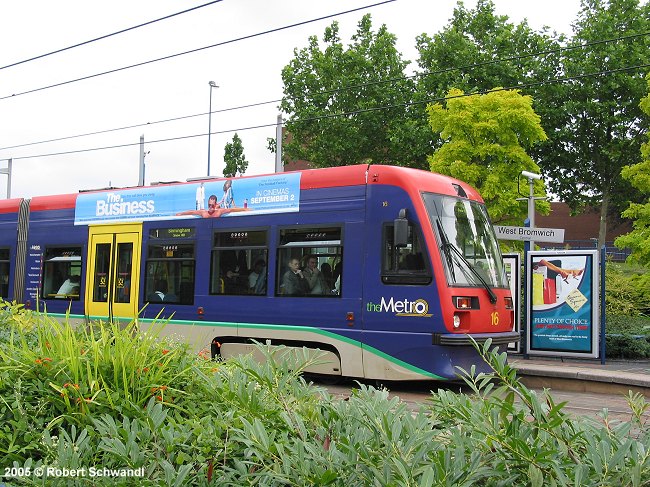 The Birmingham West Midlands Metro opened on 31 May 1999 and is the first of a planned 3-line network of a modern metro-tram, i.e. similar to a German Stadtbahn it runs partly on streets. The original Line 1 was 20.4 km long and started at Snow Hill railway station in the centre of Birmingham. It uses an old railway alignment for about 18 km through Wednesbury and West Bromwich towards Wolverhampton. The final 2.4 km after Priestfield station in this city is along Bilston Road where it shares its right-of-way with road traffic up to its Wolverhampton terminus at St. George's. All the stops have 30 cm high platforms which provide stepless access into the low-floor vehicles. By mid-2015, all original Ansaldobreda T69 vehicles had been replaced by new CAF Urbos trams. In Dec. 2015, the original Snow Hill terminus was abandoned and replaced with a new stop further north, and the line diverted via a ramp to Bull Street from where trams finally started to run through the city centre down to the city's main railway station New Street (Grand Central).