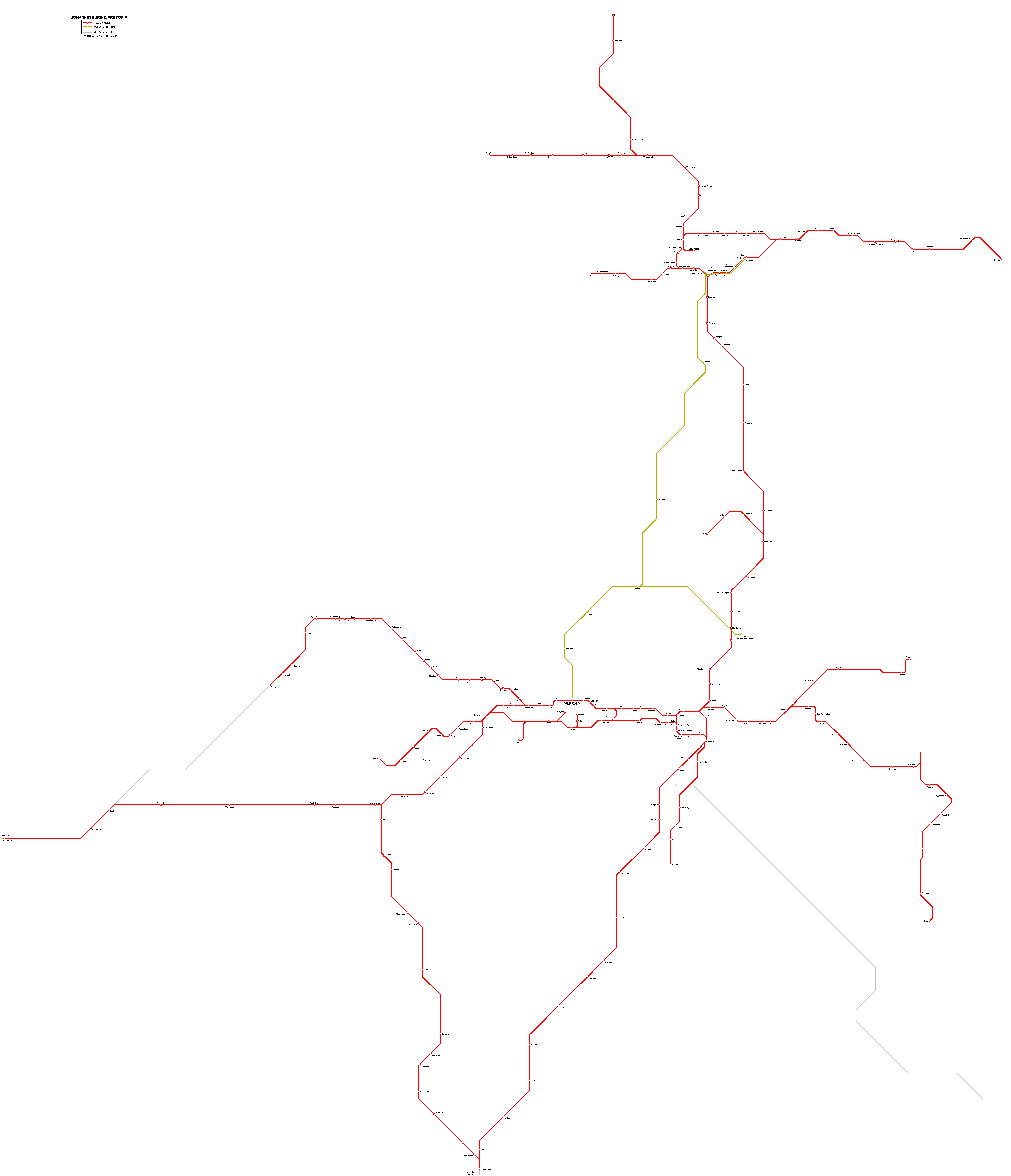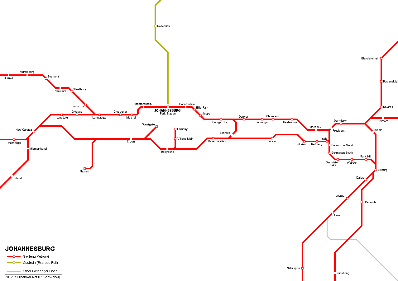 Johannesburg - 3.8 million inhabitants (incl. Jo'burg proper as well as Soweto) - in the province of Gauteng (11 million inh.) Gauteng Metrorail Network - suburban railway, operated by Passenger Rail Agency of South Africa (PRASA) - several lines radiating from Johannesburg city centre, linking cities like Pretoria, Soweto, Germiston and Krugersdorp in the entire province of Gauteng - 4-6 train per hour during peak times, every 30-90 minutes during off-peak daytime service - 1067 mm - narrow gauge - electrified at 3000 V dc with overhead wire - some routes shared with infrequent long-distance services Gautrain -