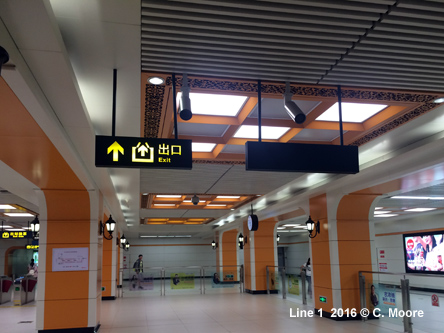 The platforms have limited information- a strip map above the doors on the full platform screens and a small station vicinity map. The platforms have small amounts of seating and also have TV screens at right angles to the platform screens which provide next-train information in Chinese only. There is audio information in Chinese and English but it is very difficult to hear. The platform areas are clad in large tiles which are a mix of white and deep, rich tones ranging from mustard to rust to burnt orange. They look very smart, clean and modern and when juxtaposed with the ornate, historic looking trimmings, such as small wall laps, located on the platforms and entrances, you get a very different and pleasant environment. Most of the stations have quite deep side platforms (Bowuguan in staggered) although there are a couple of stations with island platforms (e.g. Hexinglu) outside the central area. In general everything is well kept and the platform areas are very nice indeed. One other thing of note is that the system doesn’t appear to be overrun by staff, as can often be the case in China, and the staff are very friendly and helpful. Services run from 0600-2130 and the base headway is 8 mins. The stock was built by CNR and it is very different from most stock of that era. The trains are made up of six-car sets, the front being quite a flat structure and the solid white sides are interrupted by pale orange doors and an occasional abstract snowflake arrangement made of different sized dots (also in orange). The interior is very smart. Again, predominantly white, with deep orange side seating and each carriage end having a red/purple colour scheme, with the dot arrangement replicated in orange. It looks very smart indeed - as it is a through train one can see the carriage divisions very clearly due to the stark colour contrasts. There is a small TV which explains next station in Chinese only but, as on the platform, there are Mandarin and English announcements. The strip map above the door is in English and is electric with mini dots being illuminated as the train progresses on its journey. For some reason, this map has a kink in the line and is not a simple, straight progression. As for the 34min journey between terminals – well, it is smooth and quite speedy and dwell times are sensible. |