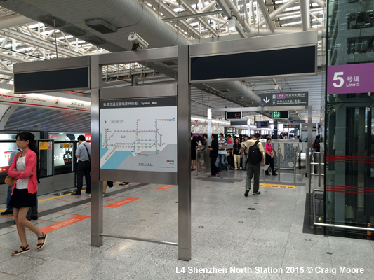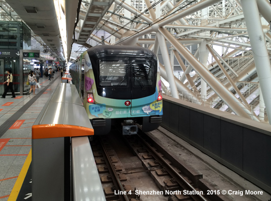Craig Moore reports from Shenzhen in October 2015 (updated in April 2017): Shenzhen Shenzhen has played on both its status as Special Economic Zone (SEZ) within an ever opening and economically dynamic P.R. China, and its strategic location between two of the giant cities of the region, Guangzhou and Hong Kong. Using this to its advantage, Shenzhen has become a huge, modern and enterprising city itself with a population of over 10 million. The Shenzhen Metro has naturally piggybacked on this growth and in just 13 years (opened 2004) it has reached 281.1km of revenue track, of which 225.9km is underground. The system has 167 stations. This makes the Shenzhen Metro the world’s 9th longest Metro and 4th longest in China. Even more impressive is the fact that 93% of this network has been brought into service since 2011. This rapid expansion has brought with it elements of inconsistency which is not normally the case in the heavily regulated Chinese urban rail environment. And so the Shenzhen Metro has different line ownership and operation, different branding, power supply, and stock. Despite this, it maintains key elements of uniformity in terms of joint ticketing, free interchange between all lines and a single schematic map. The Shenzhen Metro is also quite unique in that it has interchange with the Hong Kong MTR, which involves transfer though immigration and customs etc. Shenzhen Metro Getting there: Whilst Shenzhen is easily accessible by frequent rail services from Guangzhou, the most interesting entrance to the city and its Metro is, in my opinion, from Hong Kong. The system connects with the MRT at Lok Ma Chau (Futian Checkpoint on the Shenzhen side) and Lo Wo (Luohu on the Shenzhen side). From central Hong Kong this involves a journey on the East Rail Line (the former Kowloon Canton Railway) from Hung Hom in central Kowloon. This line is almost entirely above ground and offers views of the mountainous areas of the New Territories, the older, smaller communities and new mega housing complexes in the north of the Hong Kong SAR. Services operate at 4 min headways along the main route with each alternate train branching at Sheung Shui - thus providing 7/8 services per hour to each of the border stations. The short journey on either of these branches from Sheung Shui does attract quite a heavy ticket supplement. Each leg costs $26.50 HKD (€2.85) for the 3min ride whist the 34km journey on the line between Sheung Sui and central Kowloon to costs just $10.50HKD (€1.32). Moreover, like the Airport Line, access to these two border stations is not possible on the MTR Day Ticket. Crossing: The Lo Wu crossing is the most populous and the traditional point of entry into Shenzhen from Hong Kong. The stations on both sides have one island and two side platforms with passengers alighting from their respective systems through the island platforms. Passengers joining the respective systems here are chaperoned to the side platforms. When trains arrive, the train is emptied before the doors on the side platforms are opened. Lo Wo/Luohu stations is rather slovenly and signage (on the Chinese side) is at best adequate for the task of negotiating immigration and customs. At Lok Ma Chau/Futian Checkpoint, the platform layout is that of simple dead end island platforms with clear signage to immigration processing. In contrast to Lo Wu, this facility is newer, huge, clean and modern, although the scrummage at Fuitan Checkpoint station brings a little chaos to a pretty smooth experience. Just to note that both Hong Kong stations are above ground, whilst both Shenzhen stations are underground. As most passengers are either Hong Kong residents or PRC citizens the queues for ‘visitors’ is quite short and very speedy. After the first immigration there is a ‘no mans land’ of duty free, bureau de change and tourist information. Also enclosed within the station-immigration structure are the bridges which cross the Sham Chun waterway, dividing Hong Kong and the P.R.C. Both bridges afford views of the Shenzhen skyline, although the Lo Wu crossing, being central, is the most dramatic. Adding to this, below the bridge lies the security fencing along the southern section of the river and the views in the middle distance show the remnants of the border security/watch towers from pre 1997 days when ideological differences between the two areas were more pronounced. After the bridges, the opposing immigration booths await followed by direct access to the relative Metro stations. Naturally there are quiet and busy times but the whole process is very swift and from alighting one system to joining a train on the other system is only 5-10mins. As far as station interchange goes, these must be some of the most interesting there are. The System: The system has 8 lines (Line 11 can be described as a Suburban Metro), with 1 and 4 being the original 2004 lines and the ones connecting to the border. Normally I experience Chinese Metros having arrived straight from Europe and so it was interesting to observe the immediate differences between the Hong Kong and Shenzhen metros as these highlight the idiosyncrasies of Chinese systems and, just how incredibly efficient, effective and smart is the Hong Kong MTR. The Shenzhen Metro stations are a little less stylish in general, although the difference is now minimal as Chinese station and stock design has caught (and in some cases surpassed) its neighbours. There is a marked increase in Metro personnel, barriers and security protocols. As an aside, Chinese metro systems love barriers, either joining or leaving escalators, in connector tunnels and around entrance halls and ticket barriers. This is a necessary evil on many systems to keep the huge volumes of passenger traffic flowing well. The volume doesn’t seem to be there in Shenzhen, but still the barriers are plentiful. These differences occur despite the Shenzhen Metro approach of adopting many of Hong Kong MRT characte