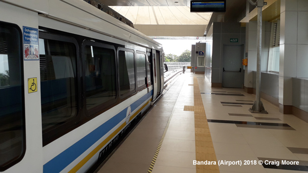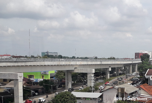In Dec. 2018, Craig Moore reports from Palembang: PALEMBANG METRO Palembang is one of the two great historic cities of Indonesia (Yogyakarta being the other) although it is today a modern city and the second largest in Sumatra. Although being only the ninth largest city in Indonesia, it is the first in the country to operate a Metro - the result of the city co-hosting the 2018 Asian Games. Although there was some interest in the Indonesian media, it is fair to say that a rather strange, underwhelming fanfare has greeted the arrival of the country’s first Metro. This is because of a splintered opening, whereby the line ran briefly for the Asian Games in August 18 for athletes and was plagued by technical difficulties, and then subsequently it offered a very limited operation until ‘full’ service (see below) began at the end of November. Moreover, the line is branded as LRT, even though it has all the attributes of a Light Metro. I am sure when the Jakarta MRT opens next March, there will be much more media exposure. Line: The single line is 22.3km (revenue Km) and runs on elevated viaduct (1067 gauge-third rail power), hosting 13 stations on its weaving route from the airport (Bandara) in a south-easterly direction to DJKA. Bandara station is attached to the airport terminal via a large connector building, although signage in the terminal for arriving passengers is limited and even outside (where access to the connector building is gained) the signage brings confusion. This station is different from all others on the line with stub platforms and a bright interesting canvas roof design. The line runs very slowly as it leaves the airport in an eastward direction before negotiating a sharp curve to head southwest to Asrama Haji (5.5km), followed by a further slow turn to set the line on its south eastward trajectory. The line is very very slow in this initial section despite having few stations - Punti Kayu (woods/copse) is 8.4km from the airport. Station gaps diminish from here as urban density grows but speeds on the straight section do not increase greatly and slow down again around the Demang-Dishub kink. It is here when the line has a more truly urban feel and offers some interesting views, compared to the semi-rural feel in the north. The viaduct runs close to buildings and is higher in this central section with Cinde and Ampera the most central stations. This section also brings a little speed to the running before the line crosses the Musi next to the famed road bridge with good views of the river activity. Urban density then again diminishes (as does the train speed) as the line runs to the sporting facilities around Jakabaring. There are long dwell times at most stations and the entire journey takes 1h02. With average speeds of 22kph, this is a very slow service, the line is quite juddery and the ‘flange squeal’ on the bends is deafening at times. Stations: With the exception of the airport station as mentioned above, all others are identical structures with ground-level ticket hall supported by broad pillars, a ticket office (no machines), rudimentary turnstile barriers and basic directional signage. Escalators or stairs lead to the side platforms. These are quite narrow and basic with limited seating (but more than enough for current passenger numbers), a basic line map and RTI board - there are no station name plates on the platform. The RTI board does not show next train but every train departure, such is the limited service. Platforms are built for five-car trains and so the current three-car service stops at the front end of the platform (to note that trains crawl into stations very slowly). Stations have smart bowed roofs, supported by beams painted in different bright colours. These colours add something to what is generally a quite bright, but basic and unadorned environment. The stations are supported by an army of staff and security - and at most stations these are more numerous than passengers. Trains: The Palembang LRT uses Indonesian built PT INKA stock, operated as articulated three-car units, the middle car being slightly longer than the end carriages with luggage racks. The trains have a white exterior with black streamlined frontage and blue and orange stripes below the side windows. The interior has bright blue cushioned seating, with rudimentary strip map above the door (this has coloured dots below the station name representing the colours of the station support beams. There is also a basic LCD screen at carriage ends which plays loud stirring music and there is also a little first aid cupboard! Electronic and audio information is in Bahasa only. The trains are bright and clean, no doubt helped by the fact that there are few passengers and that each train has a cleaning crew who wipe doors, walls and floors as the train moves along the route. Operations: The LRT is operated by the national rail company, PT Kereta Api and is maintained by an army of staff at stations and on trains - as these are Indonesians, they are naturally humble, warm and friendly. Services run from 0615 to 1800 (early finish) and have irregular headways – these normally being around 35mins, although there are some shorter headways (20mins) in the afternoon, but overall there are only 22 services in each direction, each day. Tickets cost 10000 rupiah to/from Bandara and 5000 between other stations. In addition, passengers have to purchase a 25000 Rupiah travel card. This means for the occasional user, a one-way ticket from the airport costs 35000 RPH (€2.12) which is very expensive by Indonesian standards (a Jakarta suburban rail ticket is approx €0.20). On most of the route there were few passengers and a combination of several factors (speed/infrequency/cost) contribute to these very low patronage rates. Summary: A new metro and a new metro country - it is a compliment to Indonesia that it is finally developing its urban rail environment and I hope that the Palembang syste