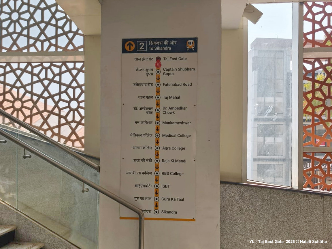 Agra, in the state of Uttar Pradesh, with some 1.8 million inhabitants in the metropolitan area, some 200 km south of Delhi; well-known for the Taj Mahal. X-shaped 2-line metro system under construction since 2021. Line 1 - northwest to southeast, 14.3 km (6.6 km elevated, 7.7 km underground) Line 2 - southwest to northeast, 15.4 km (all elevated) 06 Mar 2024: (Yellow Line) Mankameshwar Mandir - Taj East Gate