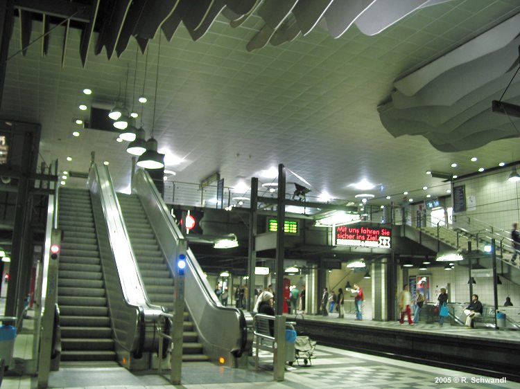 Bielefeld has 320,000 inhabitants and lies in the east of the German land of North-Rhine - Westphalia, half way between Hanover and Dortmund. The Bielefeld Stadtbahn is a system similar to those operating in Stuttgart, Cologne, Frankfurt or Hanover, i.e. a network combining metro/subway and tram features. When construction of Stadtbahn tunnel sections started in the early 1970's in the near Rhine-Ruhr area (Dortmund, Essen, Bochum, etc.), Bielefeld built its first underground station Beckhausstraße, which opened on 21 Sept. 1971. After that further expansion of the underground network came to a halt due to financial problems. It was finally resumed in the mid-1980's when the north-south tunnel through the city centre was excavated. It opened on 28 April 1991 and included 4 underground stations, Jahnplatz and Hauptbahnhof (central railway station), which are used by all lines, and Wittekindstraße and Nordpark, which are only served by Line 3 trains heading for Babenhausen Süd. Hauptbahnhof was built as a major junction with four tracks, 3 of them on the upper -2 level, and one for Line 1 and Line 2 southbound trains on the lower -3 level. The last tunnel section for Line 4 from Rathaus to the Universität, with two underground stations Siegfriedplatz and Rudolf-Oetker-Halle, finally opened on 2 April 2000 after some delays. The surface extension to Lohmannshof opened on 29 Sept. 2002. In August 2021, lines 3 and 4 swapped their eastern termini, with Line 4 now serving the Stieghorst leg. The Stadtbahn network has a total length of 33.5 km and uses 1000 mm gauge. The seven underground stations all have high platforms, most surface stops now have high platforms too, but a few have not yet been rebuilt accordingly and therefore trains are equipped with folding steps.