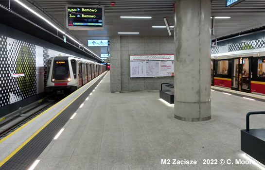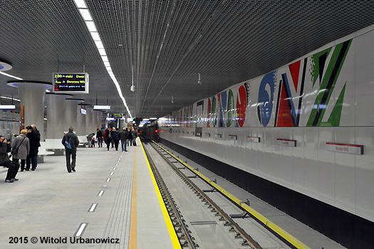 The initial 6.1 km section of Line 2 between Rondo Daszyńskiego and Dworzec Wileński finally opened on 08 March 2015. It was excavated by tunnel boring machines. Interchange with Line 1 is provided at Świętokrzyska station. All the stations have a similar design, but each with a different colour assigned. The line is operated by a fleet of 20 six-car Inspiro metro trains supplied by Siemens/Newag.