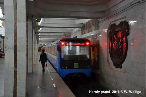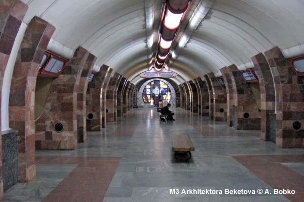 With almost 2 million inhabitants, Kharkiv (Khar'kov in Russian) is Ukraine's second largest city, situated in the eastern part of the country. Initially a combined network of existing suburban and new urban lines was planned during the 1960's, but when the first tunnel sections were finished common 2.7 m wide rolling stock was ordered for exclusive metro use. The Kharkiv Metro was inaugurated on 23 August 1975 (10.4 km with 8 stations). Stations in the city centre are very deep, less so in outer areas. Similarly to the Moscow or Kyiv metros, most stations are beautiful underground palaces. Platform length is 100 m for 5-car trains on all lines. Between Kyivs'ka and Barabashova, the Saltivs'ka Line crosses the Kharkiv river on a 988 m covered bridge. The network has a total length of about 38.5 km with 30 stations (2016):